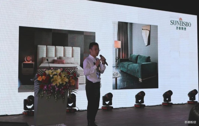 华灯璀璨的开场仪式,点燃了现场如火如荼的气氛。公海jcjc5500集团集团营销总经理陈玉伟先生对晚会进行了主题发言,他对2020年的营销工作进行了总结,并着重从营销工作部署、重点项目开展、产品整合、拎包帮扶、渠道运营和移动+定制整装优势等方面对2021年的营销工作做了全面的统筹规划。同时,他还讲解了“美国梦凯莎床垫”新品的产品工艺、市场优势、产品定位,使经销商对我们的新产品拥有更深入的认识和了解。